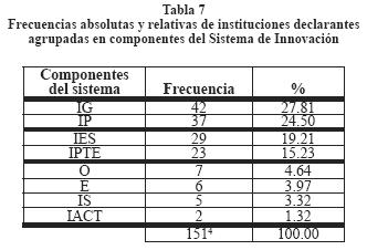 Agrupando las instituciones declarantes por componentes del Sistema de Innovación, en orden decreciente de frecuencias, tenemos (ver tabla 7):