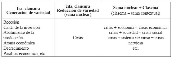 La segunda clausura consistió en reducir la variedad por un proceso de abstracción conceptual para llegar a definir el sema nuclear o unidad mínima básica de significado que nuclea a su alrededor distintos términos equivalentes, y el cual sólo puede potenciar su significado pleno en el contexto en el que la palabra es utilizada (Quezada, 1991; Greimas, 1979).