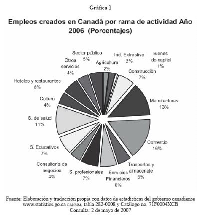 Las principales ocupaciones dentro del sector servicios fueron a su vez de salud y asistencia social 10.90%; los servicios educativos 7.02%; los servicios profesionales, científicos y técnicos 6.65%; por lo que respecta a la participación de hoteles y restaurantes 6.22%; consultoría para empresas 4.29% y los empleos de la administración pública 5.02% (ver gráfica 1) (http://canada.gc.ca, Labour Force Characteristics, 2 de diciembre de 2006).