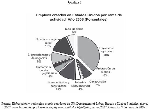 Con respecto a los sectores que están generando más ocupación en la economía de Estados Unidos, también sobresale el sector servicios, mismo que generó 197,305 plazas en 2006 y que representan un 52.45% con relación al total de empleos creados en ese año. Otra característica es que provienen esencialmente del sector privado y son especializados, mientras que el desplazamiento de actividades y servicios de bajo contenido tecnológico, continúa expandiéndose hacia otros países3 (U.S. Census, Bureau of Labor Statistics, 2006, www.bls.gov/emp).