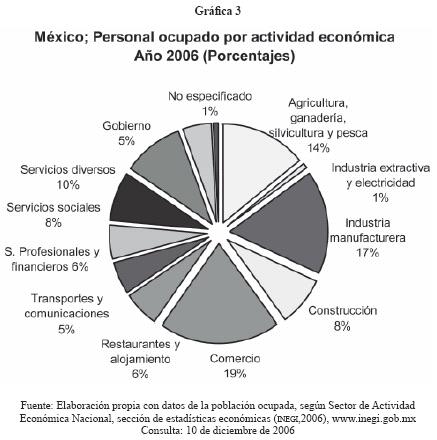 De acuerdo con la Encuesta nacional de ocupación y empleo, que publica el Instituto Nacional de Estadística, Geografía e Informática (INEGI, 2006), la mayor generación de empleos en este año se concentró en el sector servicios, equivalentes a un 59.17% de la población total ocupada, seguido del sector industrial con un 25.91% y un 14.15% del sector agropecuario. Las modalidades de servicios que generaron empleo fueron los servicios diversos que no requieren un alto grado de especialización (16.91%), los servicios sociales (8.0%) y los servicios de restaurantes, hoteles y alojamiento (6.06%).