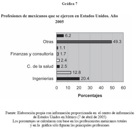 Considerando la información de la embajada de Canadá y de Estados Unidos en México (2005, 2006), las profesiones de mayor importancia que ejercen los mexicanos en América del Norte (ver gráficas 7 y 8) son las siguientes: