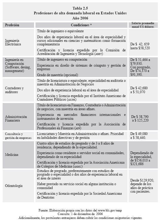 En Estados Unidos las profesiones más demandadas son: ingeniería en computación, ingeniería mecánica y de procesos, finanzas, contaduría, administrativas y de gestión, medicina y odontología. Otras profesiones recientes que han tenido éxito en los últimos diez años son las ingenierías que requieren conocimientos sobre programación, software, diseño y administración de redes. Dentro de la investigación y desarrollo científico: la biomédica e ingeniería química (ver tabla 2.5).