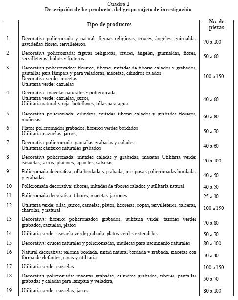 En este grupo la mayoría de los artesanos elaboran productos policromados decorativos, 10 hacen grabados y calados, 4 hacen vedes utilitarios, 3 sólo verdes utilitarios, 1 natural decorativo y 1 natural utilitario (ver cuadro 1).