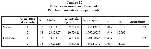 La orientación al mercado sólo tiene efecto sobre las utilidades reportadas por el grupo de cerámica (ver cuadro 10). La diferencia de medias en ventas es casi significativa (.07), mientras que el promedio de las utilidades de los dos grupos presenta una diferencia significativa a nivel de .02, siendo mayor el promedio de utilidades de los que tienen mayor orientación hacia el mercado ($15,692.30 contra $9,333.33). Esto muestra que la orientación al mercado es una estrategia muy importante para generar más utilidades en el grupo de cerámica de Santa María Atzompa.