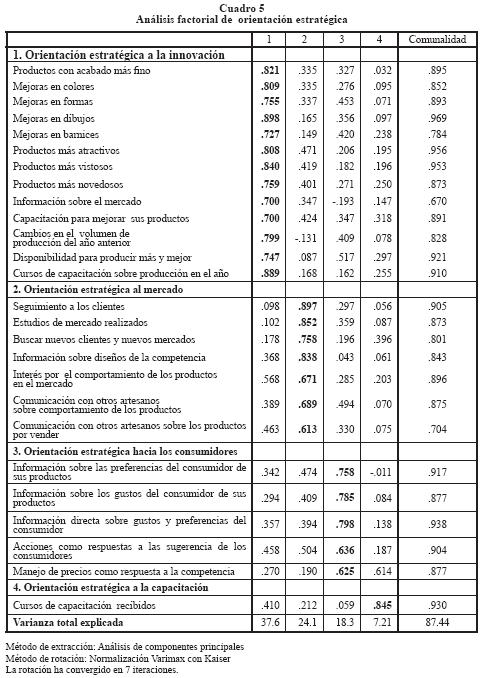 La conceptualización y la escala de orientación estratégica se diseñaron retomando a González (2003), Morales y Pech (2000) y Ho y Huang (2007); para la validez se utilizó un análisis factorial, determinando la estructura de la variable con cuatro dimensiones (ver cuadro 5): orientación a la innovación, al mercado, a los consumidores y a la capacitación.