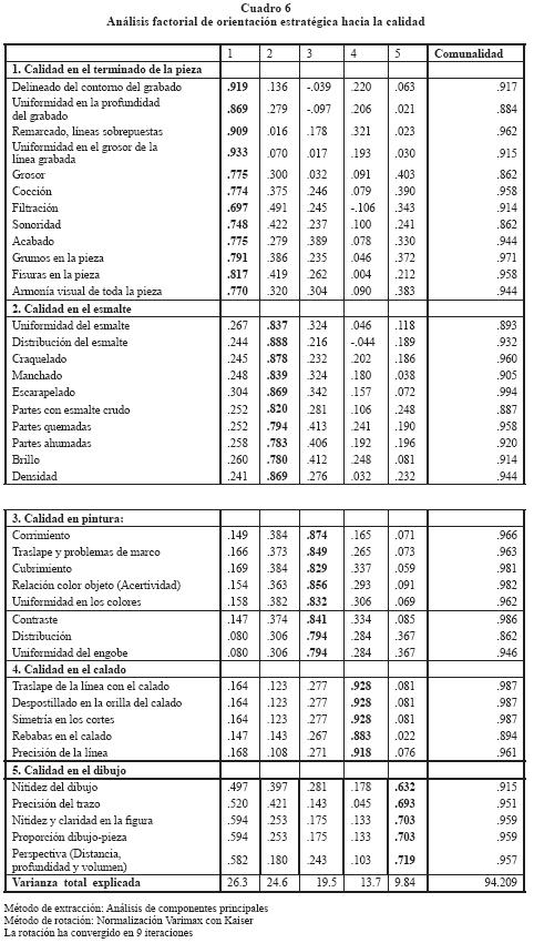 Para medir la orientación hacia la calidad de las piezas se utilizaron 42 reactivos que fueron calificados en una escala con valores de cero a diez recodificándola en alta y baja calidad. La evaluación se basó en la observación, se sistematizó de acuerdo con las dimensiones que se muestran en el cuadro 6.