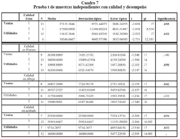 La evaluación del impacto de calidad sobre el desempeño se realizó con una prueba t Student con muestras independientes (ver cuadro 7). Sólo la calidad en terminado, en pintura y dibujo, presentaron una diferencia significativa con respecto las dimensiones de desempeño. La calidad en pintura se relacionó únicamente con las utilidades, mientras que la calidad en dibujo presenta diferencia significativa sólo con ventas. La dimensión más importante es la de calidad en acabado de las piezas de cerámica porque muestra diferencia significativa muy alta y con las dos dimensiones de desempeño, lo que explica la capacidad de orientación estratégica que se despertó en los artesanos durante el periodo de trabajo.