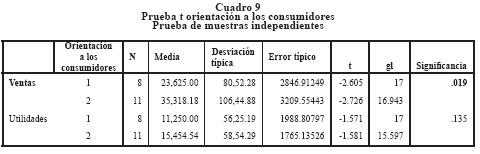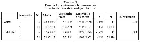 En el cuadro 8 puede observarse el efecto que tuvo la orientación en innovación sobre las ventas y las utilidades. La diferencia entre los dos grupos es significativa; es decir, los que realizaron mayor innovación tuvieron un promedio de ventas más alto durante el año de trabajo, ($34,107.14 contra $20,000.00), además reportaron más utilidades ($5,225.15 contra $2,408.31). También puede apreciarse cómo el efecto de los que más innovaron es mayor en las utilidades que en las ventas, pues tienen una significancia mayor (0.002, contra 0.000).