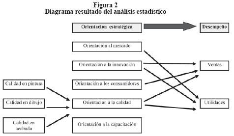 En la figura 2 se observa cómo la orientación a la capacitación queda fuera del modelo, la orientación a la calidad y hacia la innovación son las variables que más efecto tiene sobre el desempeño, y la orientación al mercado y a los consumidores sólo afectan las utilidades de los negocios de alfarería en Santa María Atzompa.