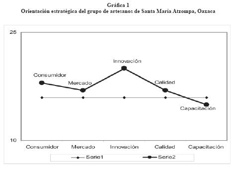Una forma de ver la orientación estratégica de los artesanos es determinando el mapa estratégico, tal como se muestra en la gráfica 1, donde se puede observar que la estrategia de los negocios artesanales está más orientada hacia la innovación y menos hacia la calidad, el mercado y la capacitación.