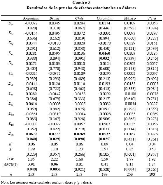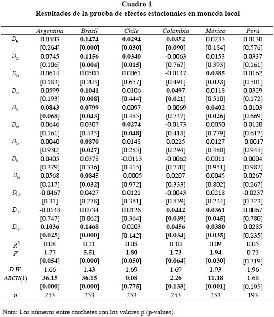 Los resultados de las estimaciones efectuadas de la ecuación (3) para los rendimientos valuados en moneda local muestran que el mercado brasileño es el que muestra una mayor cantidad de efectos estacionales; por el contrario, el mercado accionario de Perú no presenta ningún efecto de este tipo como se puede apreciar en el cuadro 1.