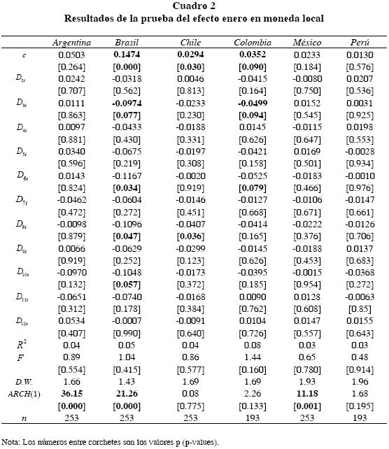 Las estimaciones de la ecuación (4) para evaluar la presencia o no del efecto enero en los rendimientos de estos mercados valuados en su propia moneda se presentan en el cuadro 2, las cuales dan cuenta de que dicho efecto está presente en los mercados de Brasil, Chile y Colombia, aunque este último al nivel de significancia del 10%. No obstante, la estimación para los rendimientos del mercado de Brasil presenta efectos ARCH al igual que para los mercado de Argentina y México por lo que dicha especificación se volvió a estimar a través del modelo GARCH(1,1), bajo esta especificación los mercados de Argentina, Brasil y México presentan efectos ARCH.