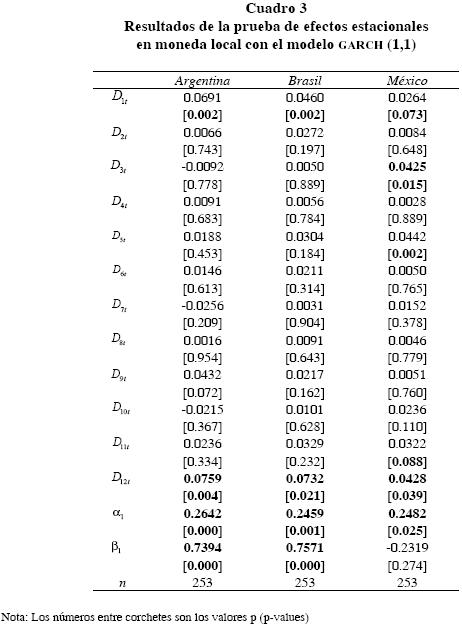 Sin embargo, la estimación para el mercado accionario de Brasil presenta efectos ARCH, por lo que se procedió a realizar la estimación a través del modelo GARCH(1,1). Se observa que con la especificación para incluir los efectos ARCH disminuye considerablemente la presencia de efectos estacionales significativos en el mercado brasileño, como se puede ver en el cuadro 3 en el que se muestran en negritas los coeficientes estadísticamente significativos con sus correspondientes valores p encerrados en corchetes.