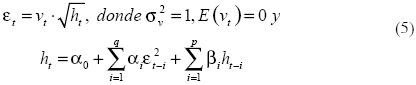 La varianza del modelo puede ser dependiente del tiempo y expresarse como una función de realizaciones pasadas. Bollerslev (1986) generalizó la metodología ARCH que introdujo Engle (1982). Se ha encontrado que este tipo de modelo es muy útil en economía y finanzas debido a su gran flexibilidad en la modelación del segundo momento de la distribución de los rendimientos. Si el término del proceso de error es:
