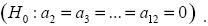 donde Rt es el rendimiento en la mercado accionario en el tiempo t, ai es el rendimiento medio del mes iésimo, Dit son las variables dummy estacionales como se definió anteriormente, y ut es un término de error, idéntica e independientemente distribuido, iid . La hipótesis nula a ser probada es que los coeficientes ai son iguales. Si dichos coeficientes son iguales entonces no existen efectos estacionales, y viceversa.