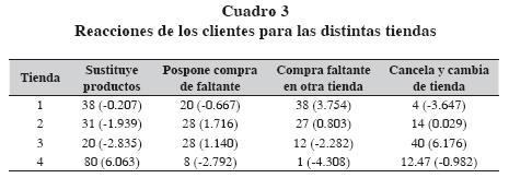 La comprobación de las hipótesis H4 y H5 se realizó mediante la comparación entre los cuatro tipos de tiendas en cuanto a las distintas alternativas de acción reportadas por los clientes ante la presencia de OOS. El cuadro 3 resume los resultados, las entradas del cuadro son porcentajes de clientes dentro de cada tienda; por tanto, el total por renglón suma el 100%. Se aplicó la prueba de jicuadrada a los datos del cuadro cruzada, el estadístico de prueba resultó altamente significante (jicuadrada = 152, gl = 9 y Pvalor = 0.000) concluyéndose que las reacciones de los clientes dependen o se asocian con las características de la tienda (conveniencia vs. surtido completo, con competencia y sin ella en el área). En cada celda del cuadro 3 se reportan entre paréntesis los residuos estandarizados que permiten deducir hasta donde los valores observados difieren sustancialmente de los esperados. La magnitud de estos residuos (superiores a +3 o inferiores a 3) permite identificar cambios de tienda en exceso para la tienda 3 (conveniencia con competencia, residuo de 6.176) y muy escasos para la tienda 1 (surtido completo con competencia, residuo de 3.647). Mientras que la tienda 4 registra un porcentaje notable de clientes que optan por la sustitución por sobre cualquier otra alternativa (residuo de 6.063).
