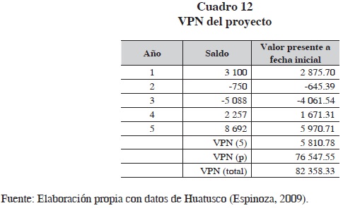 El VPN en esta situación sería positivo y de $85 537 que se obtiene de los $90 610 menos el costo de la etapa que son $13 161 ($14 188 descontados de un año). Además, esta etapa presenta un saldo a favor por el ingreso de la venta de café en este periodo que es de $8 442 ($9 100 descontados de un año); es decir, el ingreso esperado de este proyecto al inicio de la fase es de $93 978 (cuadro 7), lo cual indica que en esta etapa no se abandona el proyecto de producir orgánico (con saldo negativo la conclusión sería abandonar en este momento).