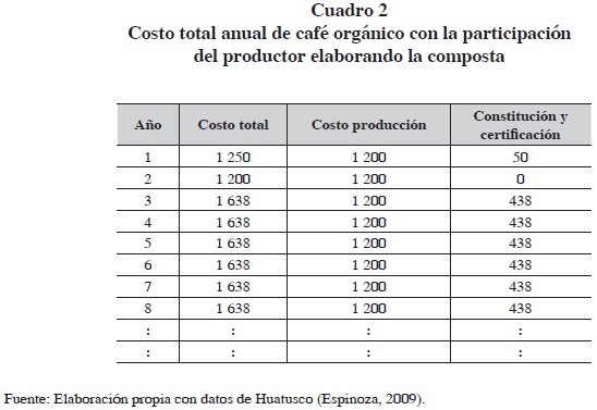 En el esquema de producción propuesto, los costos de producir café orgánico quedarían como se muestra en el cuadro 2.