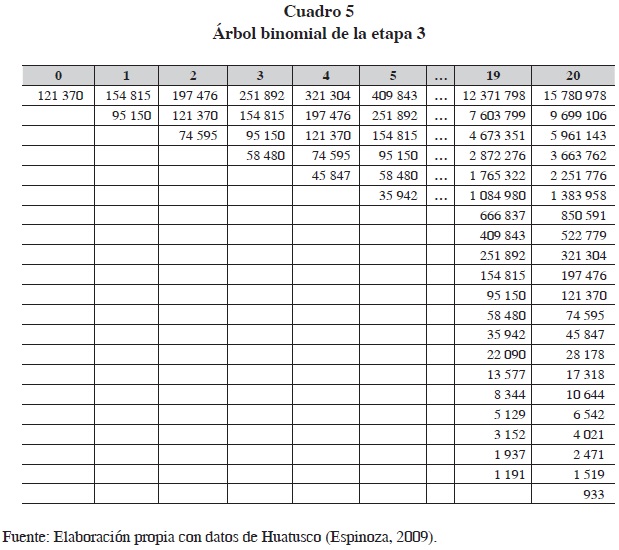 Con la finalidad de modelar un comportamiento continuo se construye un árbol binomial con veinte subperiodos (aunque se pueden simular más de veinte para tener una mejor aproximación a la distribución normal), y así aproximarse al comportamiento continuo de las variables. De este ejercicio de modelación, se recalcula (recalculada para adaptarla a un periodo equivalente a un veinteavo) la volatilidad por subperiodo, lo que resulta en 0.2433 y la tasa de interés sin riesgo del subperiodo en forma continua que es de 0.0022, mientras que los coeficientes de crecimiento y decrecimiento del árbol binomial son: U=1.2755 (exponencial de la volatilidad por subperiodo) y D=0.7839.15 Estos resultados se integran en el cuadro 4.