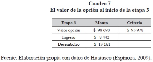 Como el valor de la opción es $79 885 y es mayor a los $12 801 necesarios como desembolso en la etapa 1, el proyecto con la opción implícita toma un valor de $82 760 que es el valor del proyecto al inicio del mismo con el método de opciones reales, como se ve en el cuadro 11.