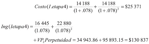 Para aplicar las opciones reales en forma clara y cronológica, se dividió la existencia temporal del proyecto en cuatro etapas; en adelante se llamará a los años 1, 2, 3 las etapas 1, 2, 3 respectivamente; mientras que la etapa 4 corresponde a lo ocurrido en los años 4 y 5 de certificación y los años posteriores, estos últimos para efectos de un proyecto de inversión corresponden a una perpetuidad. El costo de cada año y el ingreso estarán sujetos al valor del dinero en el tiempo en todo momento. De esta manera, al inicio de la etapa 4 el costo del proyecto fue de $25 371 (suma de los costos de los años 4 y 5, ambos de $14 138 descontados de uno y dos periodos, respectivamente) y un ingreso de $34 944 (ingresos en los años 4 y 5 descontados de uno y dos periodos, respectivamente) más $95 893 que es el valor presente al comienzo de la etapa 4 que se obtiene de descontar dos periodos la perpetuidad $111 436 (calculada del año 6 en adelante con el saldo $8 692), la suma de ingresos al inicio de la etapa 4 es de $130 837. Estas cifras pueden expresarse como: