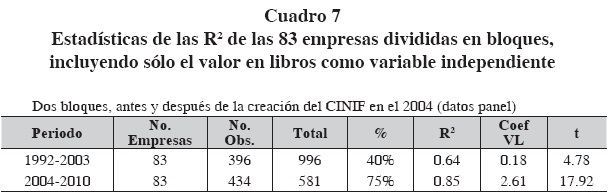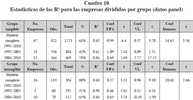 Al separar a las empresas en dos grupos, tangible e intangible, se incluyeron a las que existieron en algún momento durante todo el periodo de estudio (1992-2010), razón por la cual se utilizaron datos en panel desbalanceado. Encontramos que las dos variables (UPA y VL) son estadísticamente significativas tanto en el modelo completo como si se analiza a cada una de manera independiente. Por otro lado, la inclusión de la variable dummy con una relevancia estadística importante, confirma la existencia de una mayor significancia en la explicación de la variable dependiente a partir de la creación del CINIF.