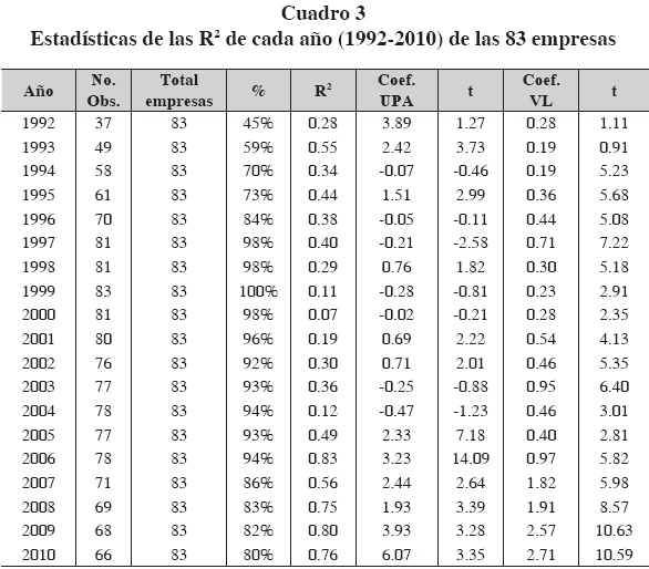 Los resultados de las R2 son mayores a 0.50 en los primeros ocho años de la muestra y se presenta un aumento considerable en el año 2006 cuando llega a 0.87 (gráfica 2). Los coeficientes para el valor en libros son positivos en 16 de los 19 años, mientras que para la utilidad por acción son positivos casi en la mitad de los casos. Para ambas variables, los coeficientes son estadísticamente significativos en ocho años (no siendo los mismos) y sólo en el caso de la utilidad por acción son significativos en algunos años posteriores (2004, 2005, 2006 y 2010) a la creación del CINIF. Cabe señalar que el valor en libros no es significativo desde 2002.
