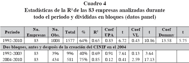 Adicionalmente se realizó un análisis para las industrias de alimentos y bebidas y de comercio por ser las que integran a mayor número de empresas y por tener las mayores R2 durante todo el periodo de estudio. Al existir pocas empresas en cada sector y al no existir todas durante todo el periodo, se realizaron regresiones con datos en panel desbalanceado. Para analizar el efecto de los cambios en las NIF, se dividió la muestra en dos bloques: 1992-2003 y 2004-2010; de igual forma, se incluyó una variable dummy en el análisis del periodo completo, la cual es estadísticamente significativa.