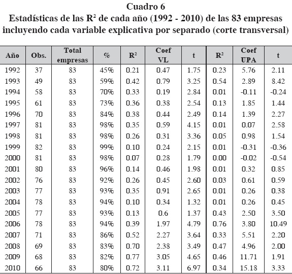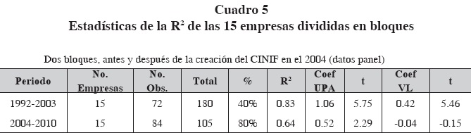 Al dividir la muestra en dos bloques, podemos confirmar que la R2 disminuyó en los últimos años y sólo el coeficiente de la utilidad por acción es estadísticamente significativo en ambos bloques (cuadro 5).