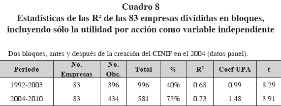En lo que respecta a la UPA, cuando se analizan las 83 empresas, la relevancia también aumenta a partir de los cambios en las NIF y el coeficiente de dicha variable es estadísticamente significativo en ambos periodos, como se observa en el cuadro 8.