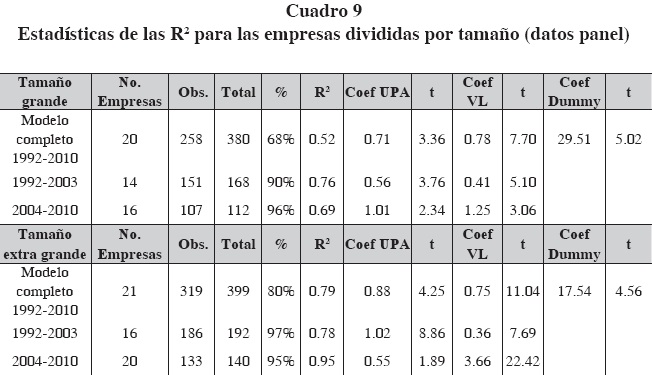 Las empresas se separaron por tamaño, utilizando cuartiles, de acuerdo con el monto total de sus activos, en pequeñas, medianas, grandes y extra grandes. Se encontró que las variables explicativas son altamente significativas en las empresas de tamaño grande y extra grande. Al utilizar la variable dummy para indicar el efecto categórico de la emisión de NIF, ésta es altamente significativa, lo que permite confirmar todavía más que a partir de 2004 la información financiera tiene mayor relevancia en la determinación del precio de la acción (cuadro 9). En el caso de las empresas de tamaño pequeño y mediano, las variables contables no fueron estadísticamente significativas.