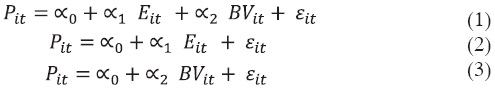 La hipótesis de investigación supone una relación de las variables independientes, valor en libros por acción (VL) y utilidad por acción (UPA), con respecto a la variable dependiente, precio de la acción en el mercado de valores (PM). Para explicar el comportamiento de la relevancia de la información a partir de las R2 3 (Palacios et al., 2006), se corrieron diferentes regresiones de acuerdo con el modelo de Ohlson (1995).