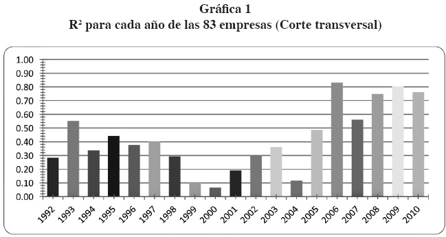 Se realiza un análisis longitudinal mediante una regresión para los datos de las 83 empresas en cada uno de los años del periodo de estudio (1992-2010). Es decir, se realizan 19 regresiones observando el comportamiento de la R2, referente de la relevancia de la información financiera.