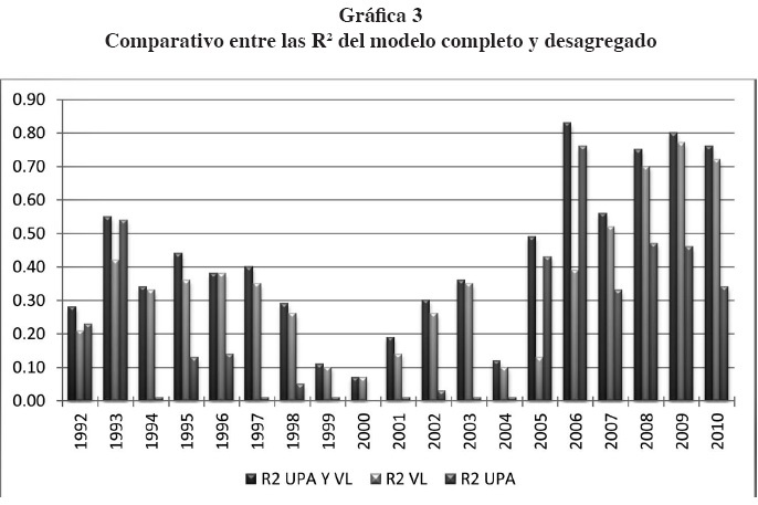 En el análisis particular de la UPA, encontramos una R2 baja en los primeros años (1994-2004), llegando a su nivel más bajo en el 2000. Sin embargo, aumenta a partir de 2005 y en 2006 es cuando se aprecia una mayor relevancia.