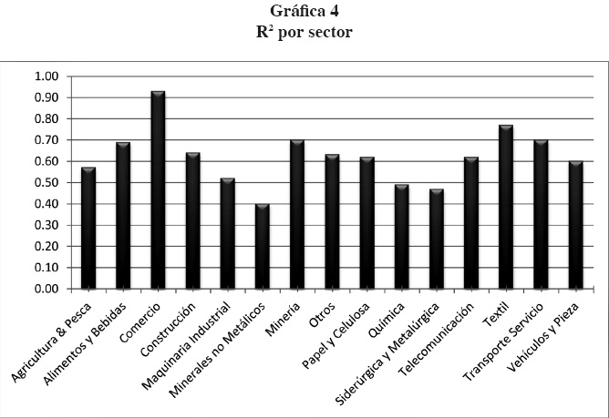 Se agruparon las empresas por sector económico integrando un total de 15 sectores. La gráfica 4 muestra que la R2 oscila de 0.40 a 0.93 en las diferentes industrias, lo cual puede deberse a la diferencia de número de empresas comprendidas en cada sector. En 10 de las 15 industrias, tanto el coeficiente de la UPA como el del VL son significativos.