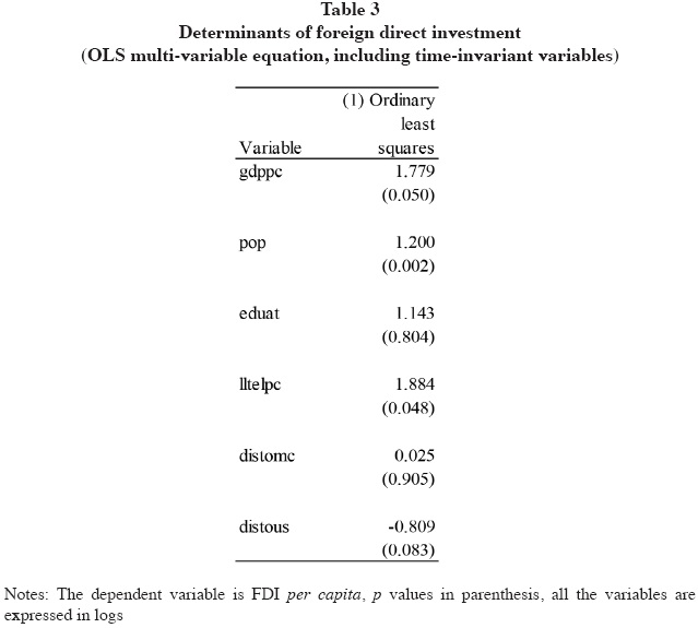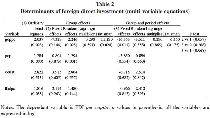 From table 2 we observe that GDP per capita, population and per capita landline telephones are positive and statistically significant and, they have an elastic effect on FDI. Only the educational attainment variable is not significant at any conventional level. This result suggests that the effect of education on FDI is rather created through the level of development in a region, represented in this equation by GDP per capita or infrastructure (per capita landline telephones), as education is strongly associated to these variables.