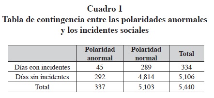 Durante el análisis se pudo observar que 45 datos identificados como anormales coinciden en fechas con los incidentes reportados por Sustainalytics. Al examinar la relación entre los datos anormales o las polaridades anormales y los eventos sociales, se encontró una relación altamente significativa, como se muestra en el cuadro 1.
