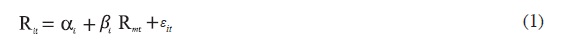 En donde Rit es igual a la tasa de rendimiento de los precios de la empresa i durante el periodo t; Rmt representa la tasa de rendimiento del portafolio de las acciones del mercado en el periodo t; αi es el término de intersección; βi es el riesgo sistemático del mercado i; por último, εit es igual al error con E (εit) = 0.