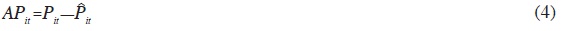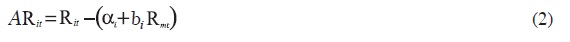 Para determinar la ecuación anterior es necesario calcular el rendimiento anormal (AR) diario de la empresa i, el cual es obtenido de la siguiente manera: