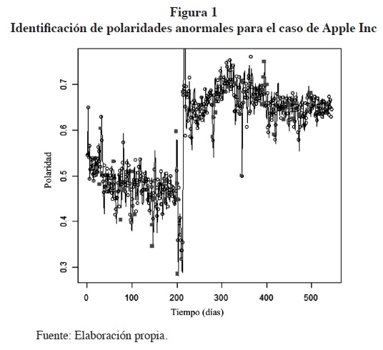 Por otra parte, utilizando el modelo de regresión local polinomial, fueron encontrados 337 observaciones o datos con polaridades de sentimientos de Twitter consideradas como "anormales"; de ellas 158 (47%) reflejan un incremento en la polaridad del sentimiento y 179 (53%) la reducen. Para ver un ejemplo de las polaridades anormales se puede observar el caso de Apple en la figura 1, donde las polaridades consideradas como anormales son marcadas con un punto gris sólido.