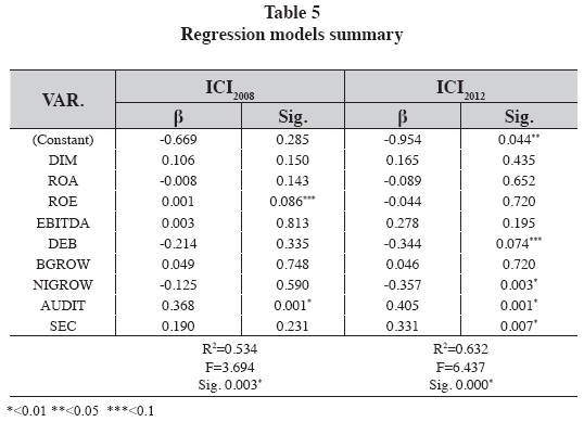 The regression models are statistically significant for a 1% for 2008 and 2012 (R2=0.534; F=3.694; Sig.0.003 and R2=0.632; F=6.437; Sig.0.000, respectively). Although several variables are not statistically significant, the regression equation for 2012 is evidenced towards an integrated predictive outlook.