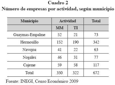 La población de este estudio se delimitó con base en cuatro criterios: 1) en estas empresas es posible observar de manera más clara los procesos de aprendizaje e innovación tecnológica a través de procesos donde se utiliza tecnología novedosa y avanzada con respecto al promedio de su entorno; 2) su principal actividad productiva es metalmecánica (MM) o tecnologías de información (TI); 3) cumplen con el criterio de clasificación de micro, pequeña y/o mediana empresa establecido por INEGI (cuadro 1); y 4) que se encuentren localizadas en cinco de los municipios que concentran la mayor cantidad de población y actividad económica industrial y/o de servicios en el estado de Sonora: Nogales, Hermosillo, Guaymas/Empalme, Cajeme y Navojoa.