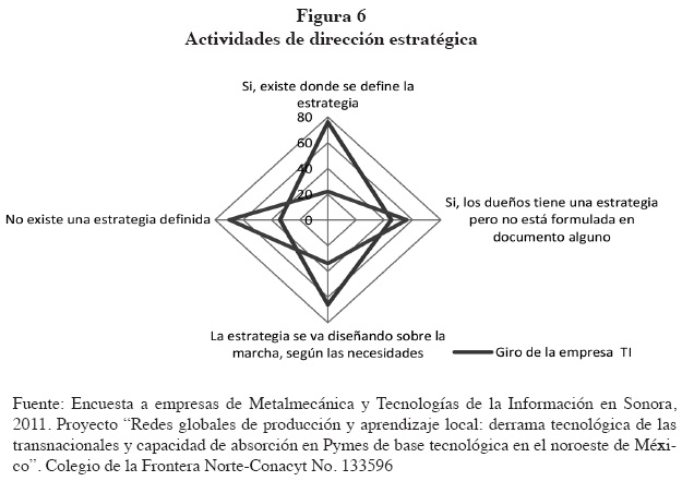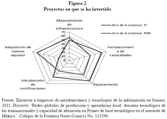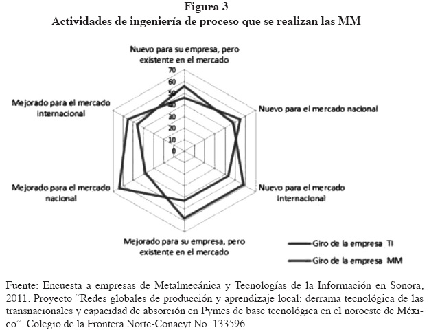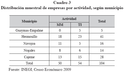 Para la delimitación del presente estudio, se han excluido los talleres de herrería del conjunto de MM y las radiodifusoras y café internet de entre las de tecnologías de la información (TI). Las empresas de TI que han permanecido en la muestra tienen como característica que se dedican a los servicios de mantenimiento técnico (desarrollo de software y programación). Debe decirse que la mayoría de las empresas fueron excluidas porque se dedican principalmente a la comercialización, ventas y reparación, con escasa actividad de integración y desarrollo de software. En cuanto a las empresas MM, el giro predominante es la producción de piezas metálicas para la industria manufacturera. Ambos giros industriales son parte del reciente auge que ha tenido Sonora y han fincado su actividad en el liderazgo que encabezan las redes globales de producción (Valenzuela, 2012).