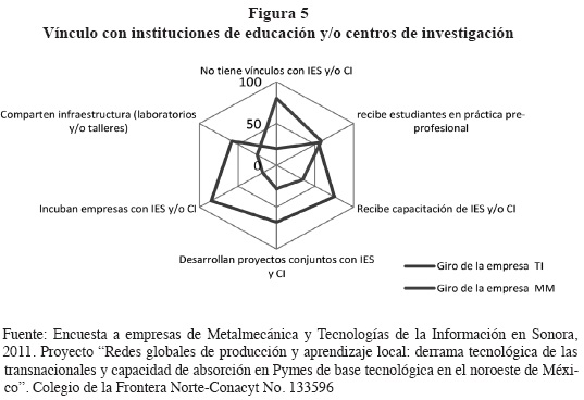 La diferencia entre sectores se amplía con relación al tema de la incubación de empresas. Específicamente, entre las TI casi 9 de cada 10 se desarrollaron en colaboración con alguna IE. En las MM la incubación de empresas es un proceso incipiente, lo que se explica por el tipo de mercado que enfrentan y porque el tipo de producto metalmecánico es más estático en su desarrollo. Además, mientras que las empresas de TI aseguran que la vinculación con instituciones de educación es una estrategia de actualización de conocimientos y para adquirir recursos humanos a menor costo, en las MM esa actualización de conocimientos es irrelevante y son los estudiantes de prácticas los que van a aprender y a adquirir conocimiento y habilidades que no les proporciona la IE. Esa práctica ha llevado a que los empresarios de MM piensen que las instituciones de educación no forman a los estudiantes con el nivel técnico que se les demanda. La figura 5 ilustra el análisis.