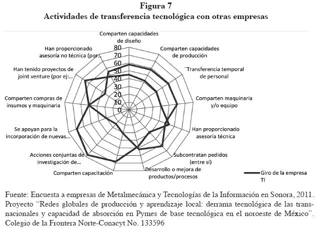 La transferencia implica el apoyo en la incorporación de nuevas tecnologías y en ocasiones hasta proyectos de riesgo compartido en el diseño y desarrollo de productos o procesos. En contraste, el sector de las empresas MM es incipiente en transferencia tecnológica ya que sólo el 23% de esas empresas la realizan.