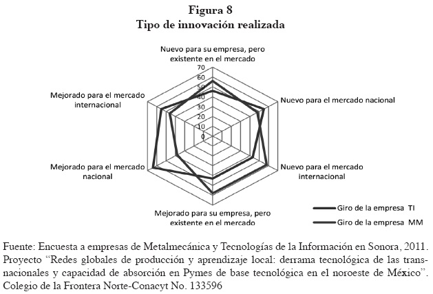 Las empresas de TI y de MM presentan una clara diferenciación con respecto al tipo de innovaciones generadas; mientras que las de TI producen con mayor frecuencia innovaciones tipo mejoras en el ámbito del mercado nacional, las MM presentan con mayor frecuencia innovaciones tipo mejoras sobre diseños existentes (adaptaciones) y diseños nuevos por la empresa, pero que ya existen en los mercados internacionales. Otro empresario que forma parte de la muestra estudiada refiere que veía como un reto proveer un producto sustituto a un cliente transnacional y desplazar al proveedor extranjero. El medio para lograr el objetivo era producir con mayor valor agregado, es decir, alargar la vida útil del producto, reducir el precio y el tiempo de entrega y agregar servicios de posventa. Esta historia parece ilustrar el hecho de que las empresas de TI en Sonora operan principalmente en el ámbito del mercado interno, mientras que las de MM tienen mayores vínculos con el mercado internacional a través de las transnacionales a las que abastecen. La figura 8 ilustra el análisis.