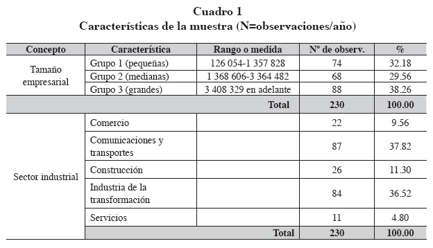 El cuadro 1 permite observar la distribución de la muestra en función al tamaño de la empresa (pequeña, mediana y grande), según el importe de sus activos totales. En función del sector, hemos obtenido cinco categorías a partir de la clasificación realizada por la BMV: comunicaciones y transportes, industria de la transformación, comercio, servicios y construcción. Los sectores dedicados a la industria de la transformación y las comunicaciones son los que acumulan el mayor número de empresas, un 74.34% del total de las compañías.
