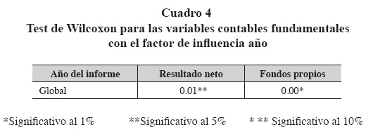 Los resultados de la aplicación del test de Wilcoxon nos permiten observar la existencia de diferencias estadísticamente significativas en el cálculo de las variables contables fundamentales. Con respecto al tamaño, las empresas medianas y grandes muestran diferencias en el cálculo del resultado neto a un nivel de significación del 10%; para la variable fondos propios las diferencias se presentan en los tres niveles (pequeñas, medianas y grandes). Por sector, son las empresas dedicadas a la transformación las que presentan diferencias en el cálculo de sus resultados y sólo el sector de los servicios no muestra diferencias significativas en el cálculo de los fondos propios.
