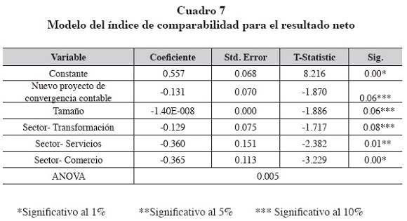 El modelo obtenido para el índice de comparabilidad a valor absoluto del resultado neto es el siguiente: